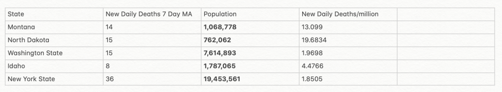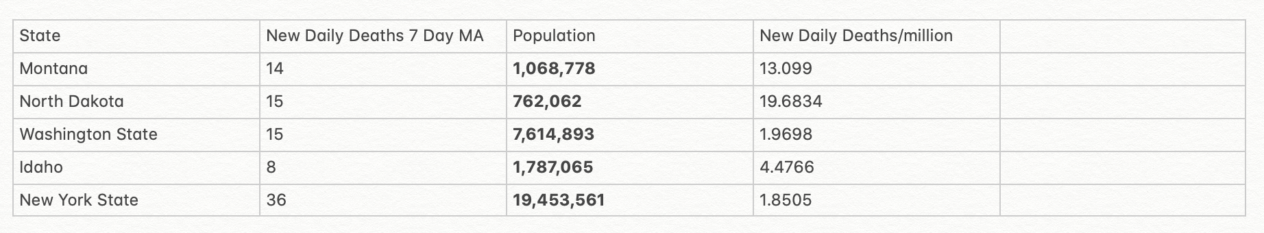 Are you seriously going to tell me that the state of New York that is 20 times the size of North Dakota has a new daily death count per million that is 1/8 that of North Dakota? Is that what you were trying to sell me?