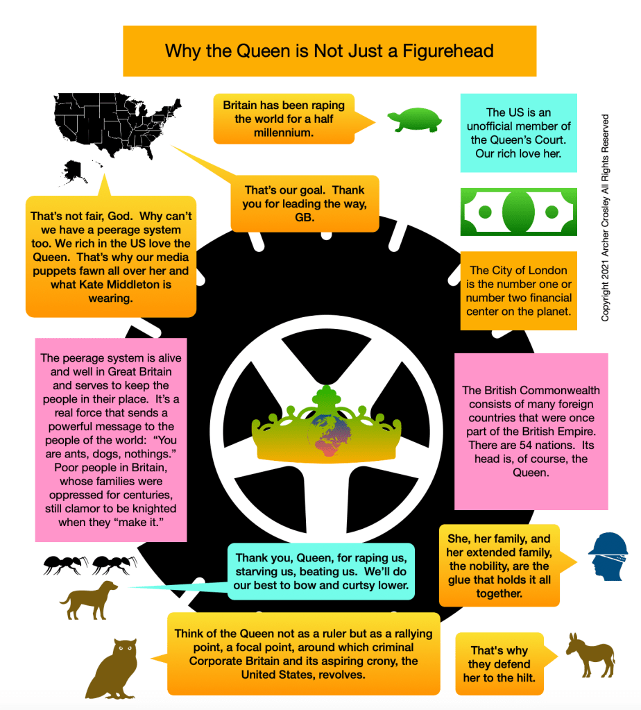 Many think of the Queen of England as a figurehead, someone without power. If she was without power, why do the wealthy elite in Great Britain defend her to the hilt? Is she a novelty act, and amusing anachronism? Hardly. She is essential to criminal Corporate Britain’s existence. Without her, their scam begins to unravel.