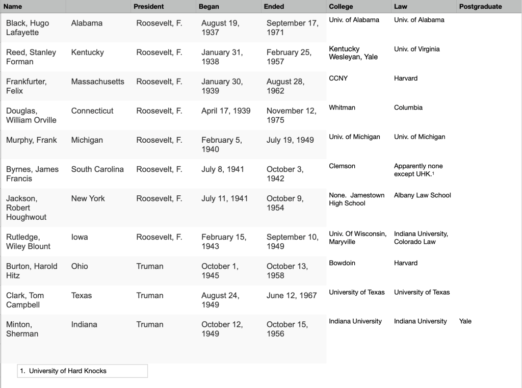 Here is a spreadsheet of Supreme Court Justices circa 1950. Make your own conclusions. As you can see there was a healthy representation of regular people coming from regular schools on the Supreme Court. That representation does not exist today because Harvard University and its puppets in the New Ivy League have hijacked our nation. Our Supreme Court is now populated by Harvard-Yale -Ivy league cocksuckers who can’t punch their way out of a paper bag, who can’t sell hot chocolate to an Eskimo. They can’t because they won’t. And they won’t because they have been indoctrinated into the power structure known as the Harvard Cartel. They are corporate puppets – signed, sealed and delivered.